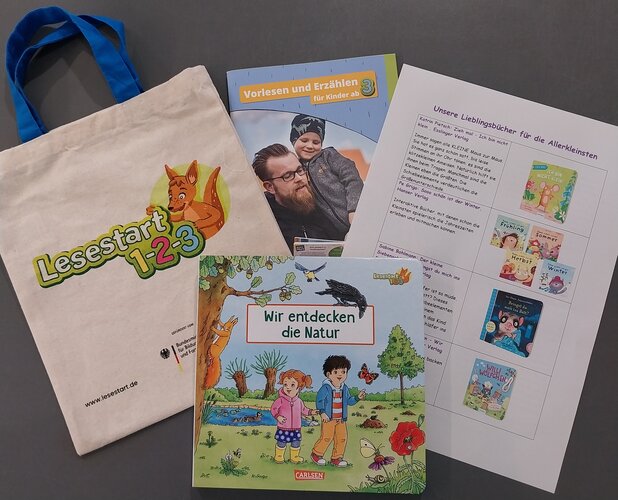 „Lesestart 1–2–3“ ist ein bundesweites Programm zur frühen Sprach- und Leseförderung. Es wird vom Bundesministerium für Bildung und Forschung gefördert und von der Stiftung Lesen durchgeführt. Ziel des Projekt: Mehr Bildungsgerechtigkeit von Anfang an. Die ersten beiden Bilderbuchsets für Kinder von einem und zwei Jahren erhalten Eltern in teilnehmenden Kinderarztpraxen, das dritte Set für Dreijährige gibt es nun bei uns.